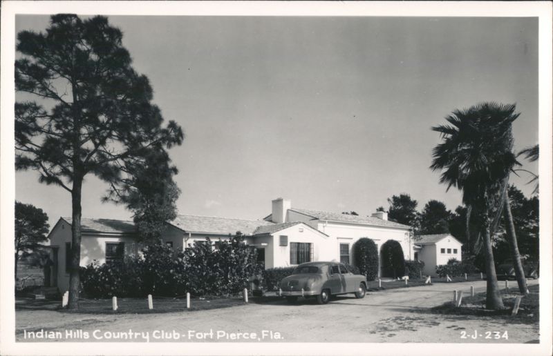 A view of the Indian Hills Country Club in Fort Pierce, Florida. A car is parked in the driveway in front of the clubhouse. Several palm trees and other landscaping is visible.