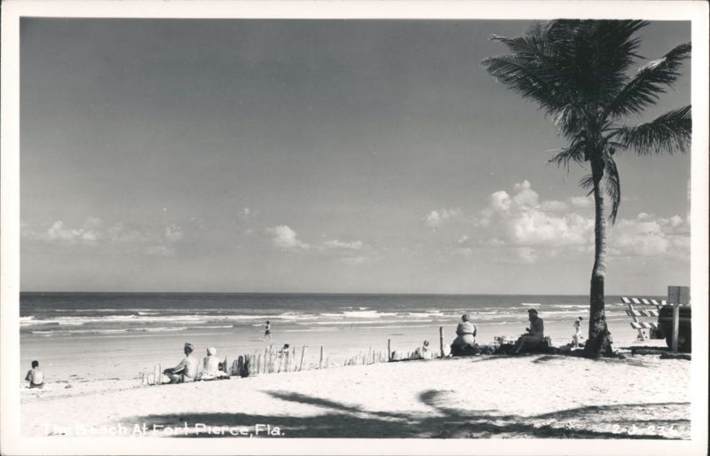 People enjoying the beach at Fort Pierce, Florida. A short wooden fence separates the beachgoers from the ocean. A palm tree stands tall near a parked vehicle.