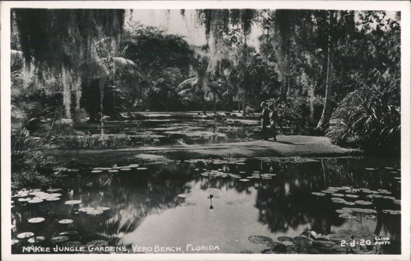 Two people stand near the edge of a pond filled with lily pads. Trees and Spanish moss surround the pond.