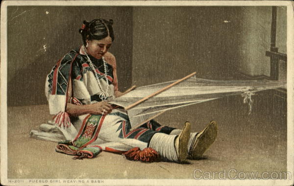 | Today the art of weaving is practically confined to three peoples. The Zuni, the Hopi and the Navaho. The looms used by the Hopi are of two kinds - a small heddle loom used in the manufacture of belts - hair strings - and garters. The other is the typical loom used by primitive peoples of many parts of the world. In spite of its apparent simplicity the Hopi produce all the blankets, dresses, kilts and sashes worn by both men and women. |