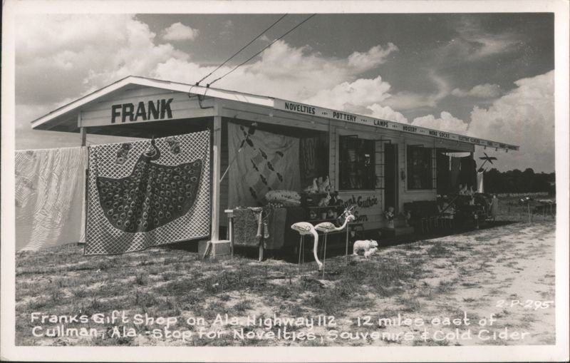 Frank's Gift Shop on Alabama Highway 112, 12 miles east of Cullman, Alabama. Stop for Novelties, Souvenirs & Cold Cider. Items for sale include blankets with peacock designs, flamingo yard ornaments, and other novelties.