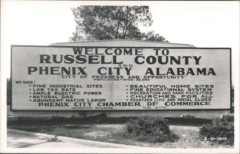 A large billboard welcomes visitors to Russell County and Phenix City, Alabama, touting the area's progress, opportunity, and amenities such as industrial sites, low taxes, ample power, natural gas, native labor, home sites, education, recreation, churches, and civic clubs. The billboard also notes the city's population exceeding 35,000 and encourages inquiries via phone. The Phoenix City Chamber of Commerce is located in the Recreation Building. |
