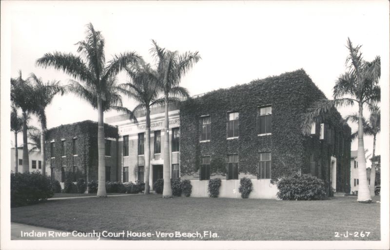 Indian River County Court House in Vero Beach, Florida. The building is covered in ivy and there are palm trees in front.