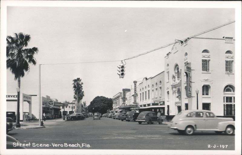 A view of 20th Street, Vero Beach, Florida. Visible are Bartlett's Hardware, Lewis Anoco Service, Florida Theatre, Vero Restaurant, and Western Union.