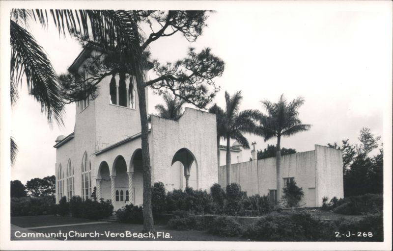 A view of the Community Church in Vero Beach, Florida. The church features a stucco exterior, arched entryways, and a prominent bell tower. Lush landscaping, including palm trees and various shrubs, surrounds the building.