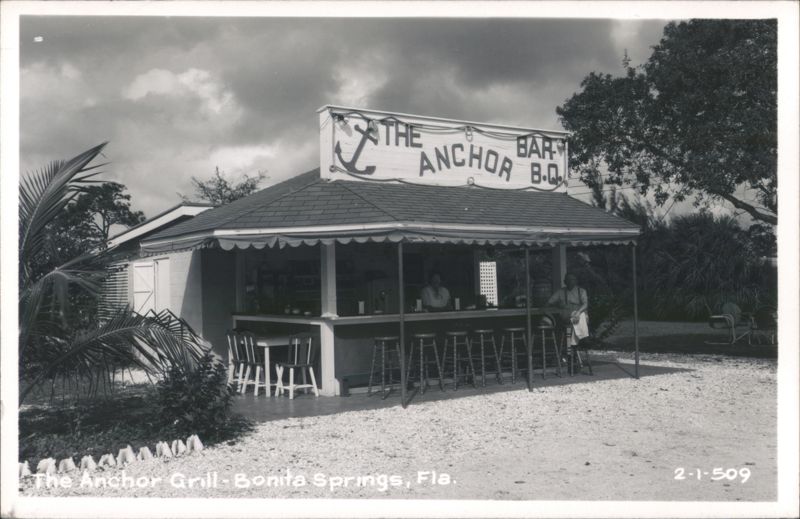 Exterior view of The Anchor Grill, Bar, B.Q. restaurant in Bonita Springs, Florida. Two people are seated at the counter, and several bar stools are visible. A table with chairs is situated to the left of the counter. The restaurant has a striped awning and a sign featuring an anchor. Palm trees and other vegetation are visible in the foreground, and a tree is visible to the right. Additional seating is available in the background. |
