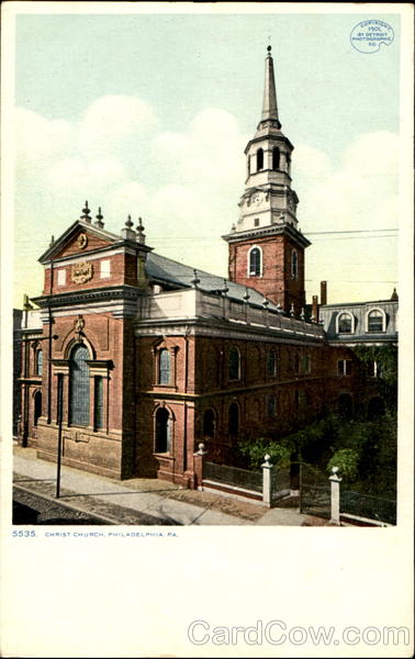 Front: 5535. CHRIST CHURCH, PHILADELPHIA, PA. COPYRIGHT 1901. BY DETROIT PHOTOGRAPHIC CO. Back: "PHOSTINT"CARD. MADE ONLY BY DETROIT PUBLISHING CO. ACC DUPES AND CANADA. FOREIGN. TWO THIS SPACE MAY BE USED FOR MESSAGE. THIS SPACE FOR THE ADDRESS.