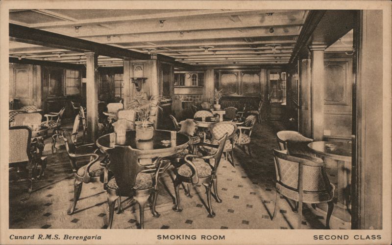 Front: Cunard R.M.S. Berengaria SMOKING ROOM SECOND CLASS Cunard R.M.S. Berengaria DINING SALOON SECOND CLASS Cunard R.M.S. Berengaria LOUNGE SECOND CLASS Back: POSTAGE POSTAGE POSTAGE