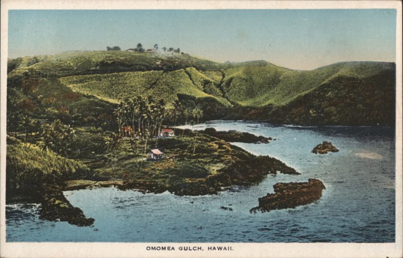 Front: COMOMEA GULCH, HAWAII. Back: M 22454 AMER SHIRONE LEIPZIG BERLIN NEW YORK- Omomea Gulch is about seven miles north of Hilo along one of the prettiest Drives in the Islands. und TWO CENTS