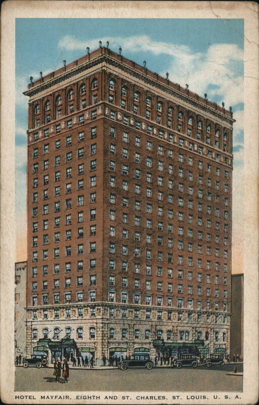 Front: HOTEL MAYFAIR, EIGHTH AND ST. CHARLES, ST. LOUIS, U. S. A. Back: 11275 TO ANYWHERE IN 8, VIA AIRMAIL MADE IN U.S.A. BY E. C. KROPP CO., MILWAUKEE