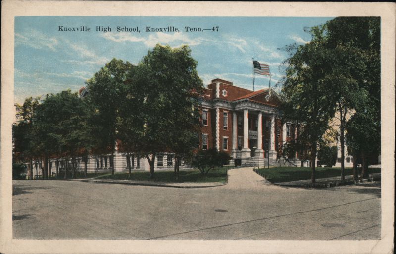 View of the front facade, with a prominent portico supported by tall columns and an American flag flying above.