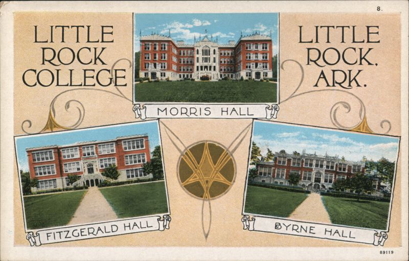 Front: 8. LITTLE ROCK COLLEGE 1 MORRIS HALL LITTLE ROCK. ARK. FITZGERALD HALL BYRNE HALL 89119 Back: PUBLISHED BY JUNGKIND PHOTO SUPPLY CO., LITTLE ROCK, ARK. MY) C. T. AMERICAN ART COLORED. T
