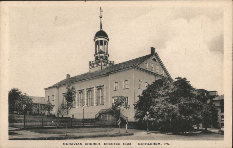 Front: 22 MORAVIAN CHURCH, ERECTED 1803 BETHLEHEM, PA. Back: PUBLISHED BY THE MORAVIAN BOOK SHOP, EST. 1747, BETHLEHEM, FA. -Post Cards of Quality-The Albertype Co., Brooklyn, N. Y.- POST CARD