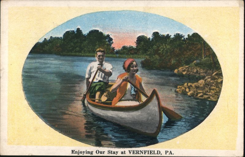 Front: 37503 Enjoying Our Stay at VERNFIELD, PA. Back: "NYCE" Quality red Landsca, s We will print SF town in black ink. Dr pecial $3.65 "Greetings from your tour e price