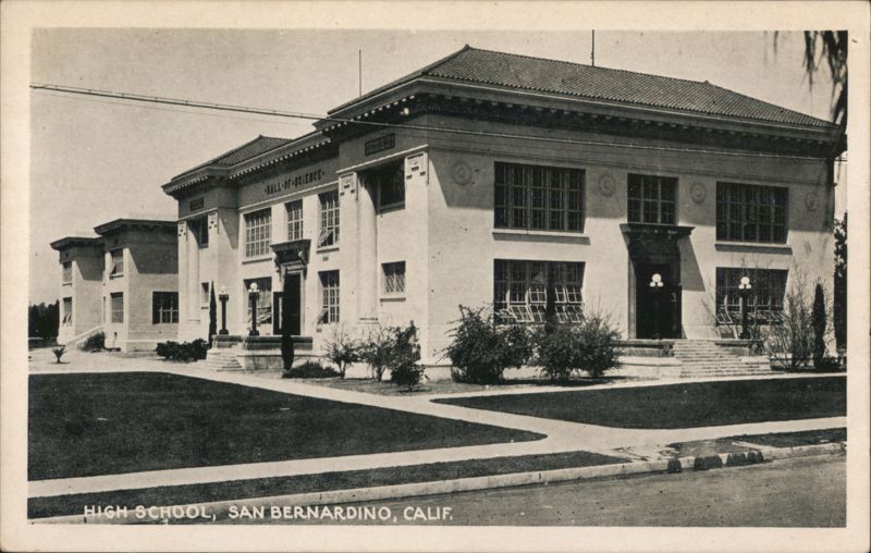 Front: WALL OF SCIENCE HIGH SCHOOL, SAN BERNARDINO, CALIF. Back: PACIFIC NOVELTY CO. SAN FRANCISCO & LOS ANGELES 25 ast STAMP