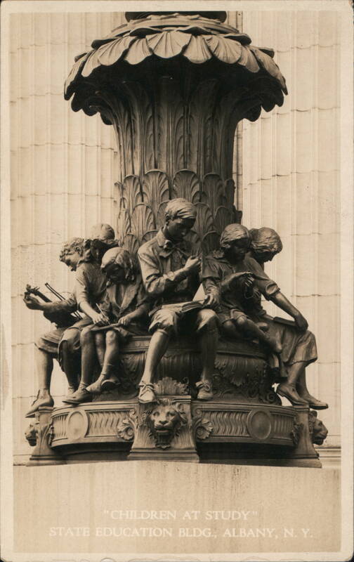 Sculpture of children playing with a hoop, with lion head at base. Children at Study, State Education Building Sculpture of children reading and studying, located at the State Education Building. |