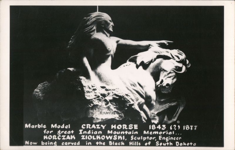 Front: Korczak Marble Model CRAZY HORSE 1843 (2) 1877 for great Indian Mountain Memorial... KORCZAK ZIOLKOWSKI, Sculptor, Engineer Now being carved in the Black Hills of South Dakota Back: r-Kodak-- L- Paper-J 173N12
