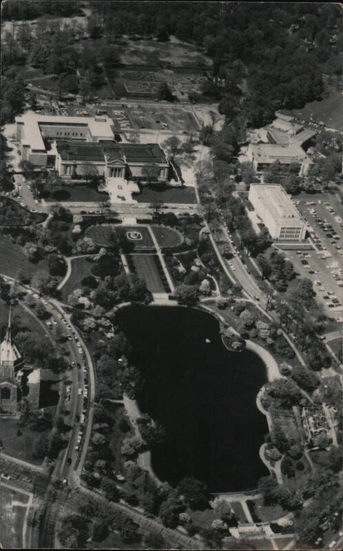 Aerial view of the Cleveland Museum of Art and surrounding area, including Wade Park and Wade Lagoon.