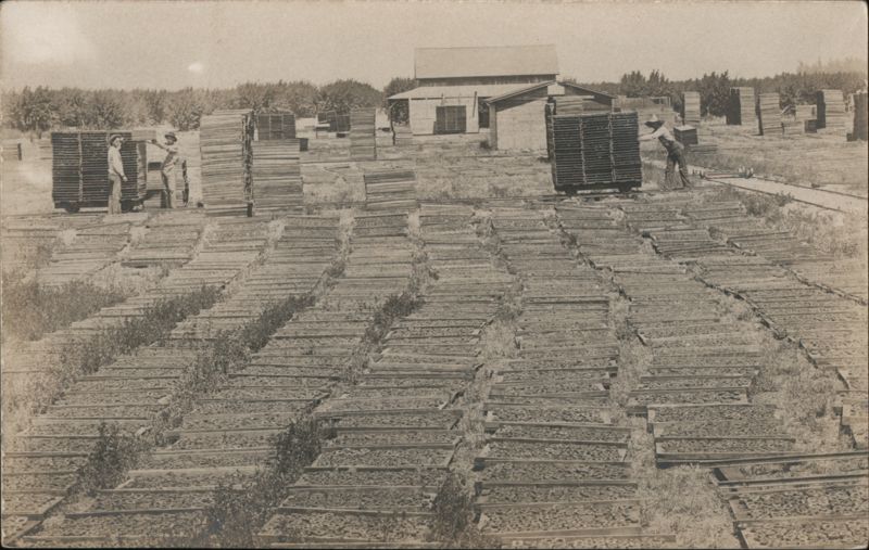 Workers moving and stacking trays of raisins in a field, with a small building in the background.