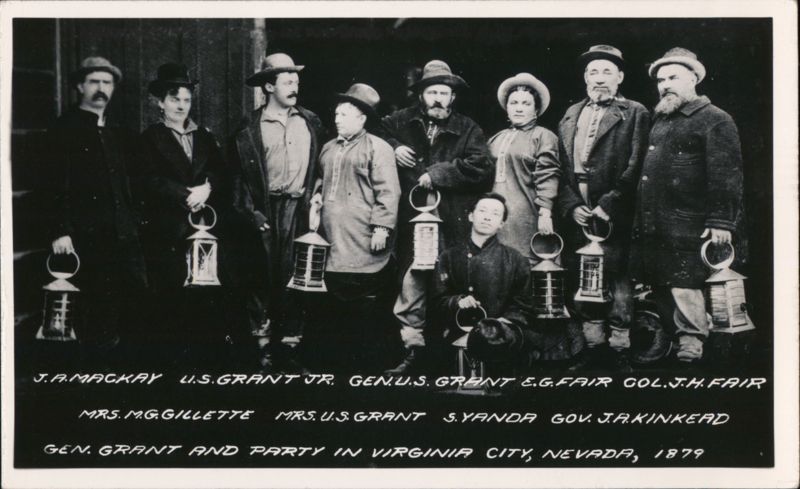 J.A.MACKAY U.S.GRANT JR GENU.S. GRANT E.G.FAIR COL.J.H. FAIR MRS. M.G. GILLETTE MRS. US. GRANT S.YANDA GOV. JAKINKEAD GEN. GRANT AND PARTY IN VIRGINIA CITY, NEVADA, 1879