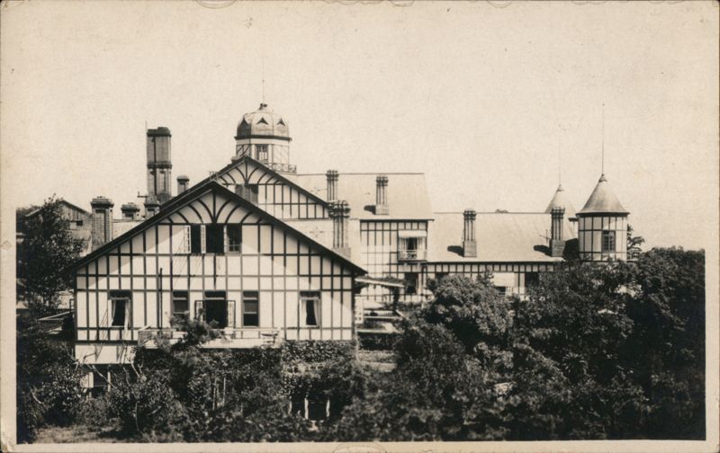 Exterior view of a large Tudor style building with a turret, surrounded by trees.