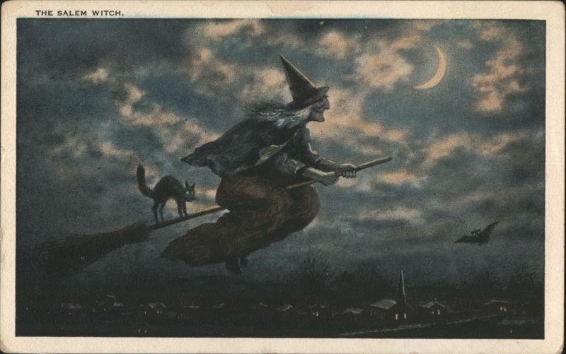 The Salem Witch Riding Broomstick with Black Cat