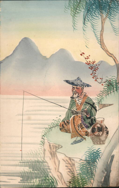 Chinese Stamp Montage Asian Fisherman in Traditional Robes, Watercolor Scene