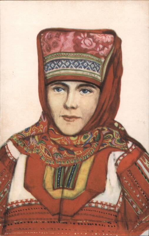 Сорока. Женский головной убор. Рязанская губерния. XIX век. Художник Н. Виноградова Издательство «Изобразительное искусство». Москва. 1971. 3a-875 Ц. 2 к. T. No 5