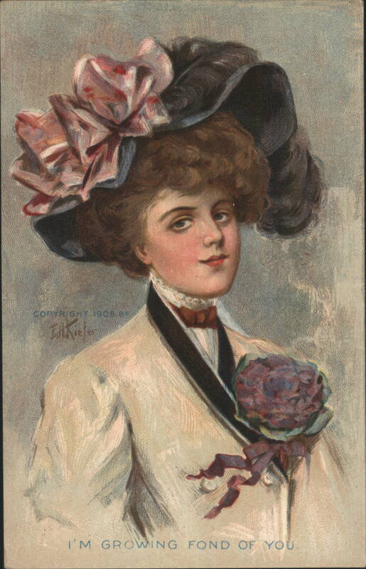 Portrait of a woman with curly brown hair, wearing a very large hat adorned with large fabric flowers in shades of red, white, and dark purple/black. She is dressed in early 20th-century fashion with a light-colored, textured jacket over a high-necked blouse with a patterned collar. A corsage of dark purple flowers with ribbons is pinned to her left shoulder. The text "I'M GROWING FOND OF YOU" is printed at the bottom. |