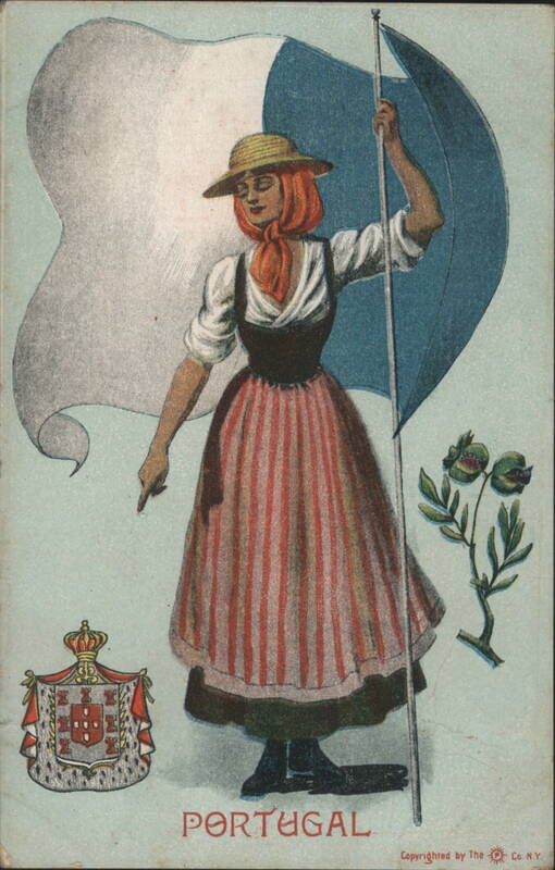 Illustration of a woman representing Portugal in traditional attire, including a straw hat, orange scarf, and striped skirt, holding the Portuguese monarchist flag (blue and white). The Portuguese royal coat of arms is displayed in the lower left. A small branch with buds is to her right. Text "PORTUGAL" at the bottom.