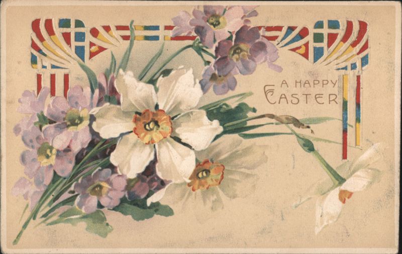 | A floral arrangement featuring white and yellow daffodils and smaller lilac-colored flowers. Stylized Art Nouveau-inspired borders in red, yellow, blue, and white are in the upper corners. The greeting 'A HAPPY EASTER' is printed on the right side. The reverse shows a handwritten message: "With best wishes for a Easter tide From N.S. Friend", addressed to Mrs. Charles Caton in Santa Cruz, California, and a postmark from Santa Cruz dated April 8, 1909. |