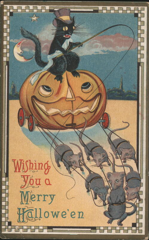 A black cat in a top hat drives a Jack-O-Lantern carriage, pulled by six mice. The text reads "Wishing You a Merry Hallowe'en".