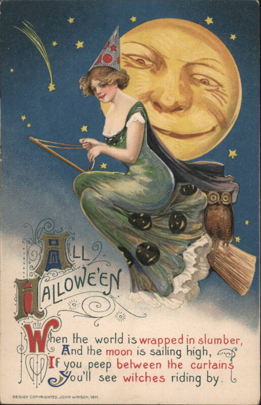 Front: LL ALLOWEEN Shen the world is wrapped in slumber, And the moon is sailing high, If you peep between the curtains You'll see witches riding by. DESIGN COPYRIGHTED, JOHN WINSCH, 1911. Back: www POST CARD. 20 ON THIS SIDE. PRINTED IN GERMANY