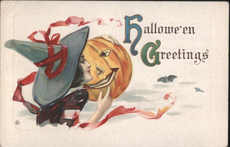 A witch in a blue pointed hat with a red ribbon embraces a smiling Jack-O-Lantern.