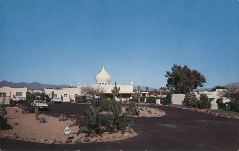 | Exterior view of the Casa Blanca Inn, featuring its distinctive architecture with an onion dome, desert landscaping with cacti and palm trees, and a circular driveway. Spacious accommodations, 115 in all, each overlooking famous Camelback Mountain from its own private patio. |