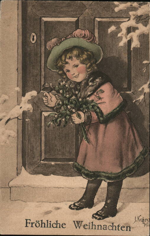Illustration of a young girl in a pink coat and green hat holding mistletoe, standing by a snowy doorway.