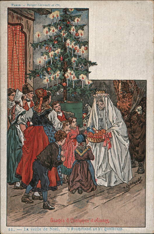 Front: ASE PARIS. Berger Levrault et Cle Usages & Costumes d'Alsace, 22.- - La veille de Noel. 'Atrijchtfindel un d'r Hansdrapp. Back: Carte postale. Postkarte 30