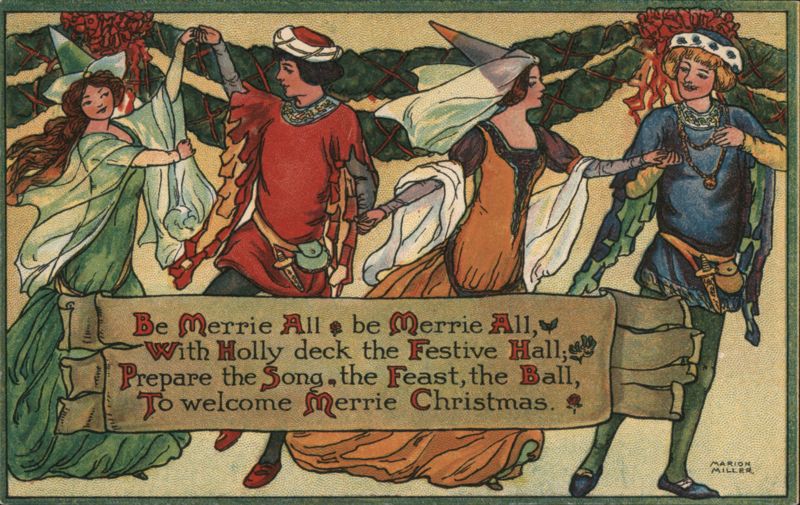 Illustration by Marion Miller of four people in medieval attire dancing, with a banner reading 'Be Merrie All be Merrie All, With Holly deck the Festive Hall; Prepare the Song, the Feast, the Ball, To welcome Merrie Christmas.' From the Peggy Hawksworth Collection |