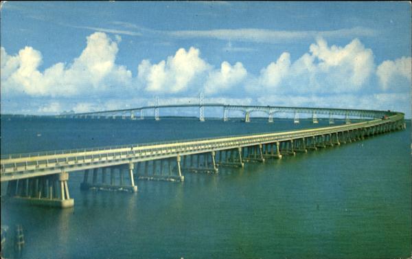 | Connecting Eastern and Western Shores of Maryland Completed in 1952 at a cost of $45,000,000, this magnificent structure represents the fruition of the dream of generations of Marylanders f permanent bay crossing. Length of suspension span -2,922 feet. Overall length -7.727 miles, Roadway about 200 feet above water at highest point. |