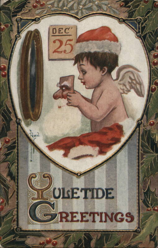 Christmas postcard featuring a winged cherub wearing a Santa hat and holding a Santa mask. A calendar shows December 25th. The border is decorated with holly.