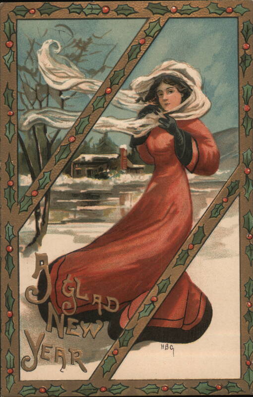Woman in a long red dress, white bonnet, and black gloves stands in a snowy landscape with a building in the background. A white scarf blows in the wind. Decorative holly border.