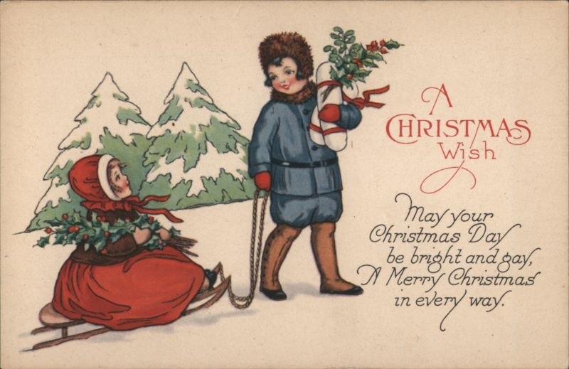Illustration of a boy pulling a girl on a sled in the snow. Both children are dressed warmly for winter and carry holly. Text includes a Christmas greeting: "May your Christmas Day be bright and gay, A Merry Christmas in every way." From the Peggy Hawksworth Collection |