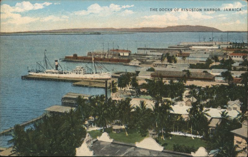 Front: THE DOCKS OF KINGSTON HARBOR, JAMAICA. Back: MADE IN USA 62 COPYRIGHT PHOTO BY E. WELLS ELLIOTT, KINGSTON, JAMAICA. 107244 C. T. AMERICAN ART COLORED SAICAGO HERE