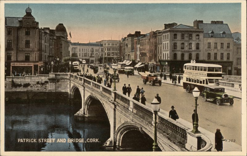 Front: PATRICK STREET AND BRIDGE, CORK. CONNESS IS GOOD FOR YOU! 1111 DAINTY RESTAURANT R.203 PUR Back: COPYRIGHT. VALENTINE'S CARBO COLOUR" POSTCARDS. VALENTINE & SONS, LTD., DUNDEE AND LONDON, VALENTINE'S THROUGHOUT 39-2 C.B. SCOTLAND