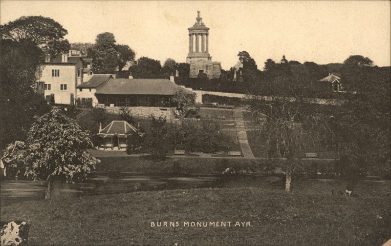 View of the Burns Monument and surrounding gardens in Ayr. The monument, erected in 1820, features a triangular base representing Carrick, Cunningham, and Kyle districts, nine columns for the Muses, and is crowned with a tripod. The gardens are planted with flowers and shrubs. |