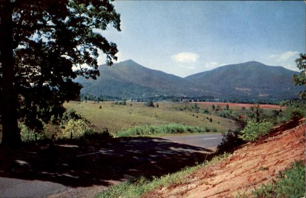 Peaks of Otter, located on the Blue ridge Parkway which connects with the Skyline Drive at Waynesboro, Virginia. Sharp Top the Peak to the left has an elevation of 3,875 and Flat Top to the right is 4,001.