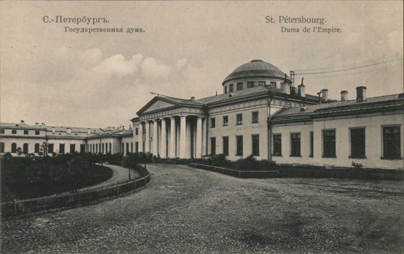 Front: С.-Петербургъ. Государственная дума. St. Pétersbourg. Duma de l'Empire. Back: Изданіе К. М. Лембергъ, С.-Петербургъ. Gw ВСЕМІРНЫЙ ПОЧТОВЫЙ СОЮЗЪ. РОССІЯ. UNION POSTALE UNIVERSELLE. RUSSIE. ОТКРЫТОЕ ПИСЬМО. — CARTE POSTALE. рап goo Imp.