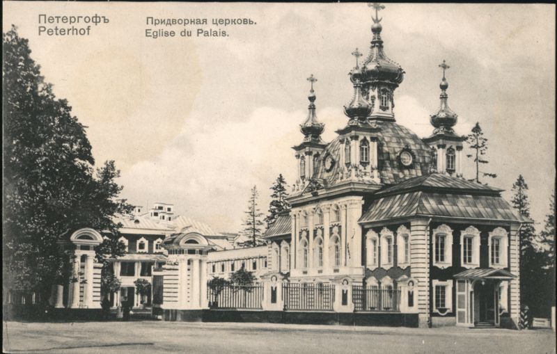 Front: Петергофъ Peterhof Придворная церковь. Eglise du Palais. Back: Изданіе,,Ришаръ" Ст. Петербургъ. № 244 ВСЕМІРНЫЙ ПОЧТОВЫЙ СОЮЗЪ. РОССІЯ. UNION POSTALE UNIVERSELLE RUSSIE. ОТКРЫТОЕ ПИСЬМО. — CARTE POSTALE. 8.2.7. goo