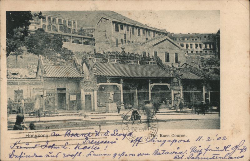 | Street view showing traditional Chinese-style buildings adjacent to the Happy Valley Racecourse. Larger European-style buildings are visible on the hillside behind. Handwritten message dated Feb 11, 1902, sent from the S.S. George W. Fenner. |