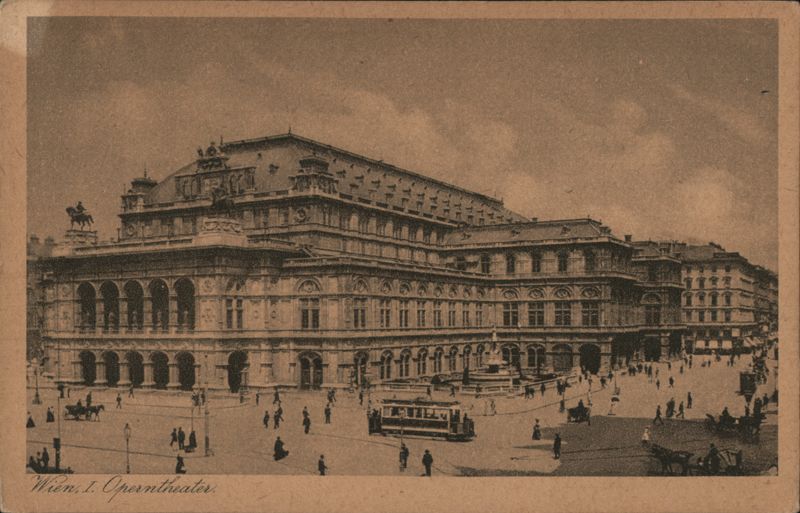 Exterior view of the Vienna State Opera building with street activity including pedestrians, horse-drawn carriages, and an electric streetcar.